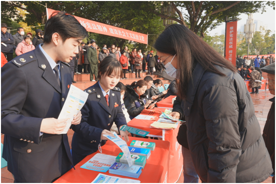 自主开展系列活动外,全市税务系统还依托政府部门“搭台”,主动融入当地各类宣传活动,持续营造浓厚的普法宣传氛围。在射洪市子昂广场的宪法宣传周启动仪式现场,税务部门设置了“普法摊位”,面对面讲解宪法相关知识,普及税收法律知识,重点辅导解答了个人所得税专项附加扣除信息确认、医保缴费等政策内容,为过往群众送上满满的法律法规知识“干货”。
