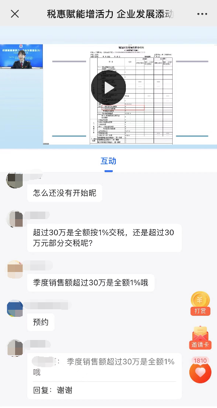 直播期间,两位授课讲师结合最新优惠政策,用“大白话”开展政策解读和案例解析,在线“圈粉”人数超3000人次,同时通过“讲师授课+助教答疑”并行模式,由业务骨干实时文字解答纳税人留言提问,让直播授课更加直观、精准解惑更加及时。“老师直播讲解了小规模纳税人适用的最新优惠政策,还细致讲解了申报表的填写要点,对我们新办个体工商户提供了很大的帮助,希望税务部门以后多多开展这类活动。”收看完直播课的个体纳税人李女士在评论区留言。