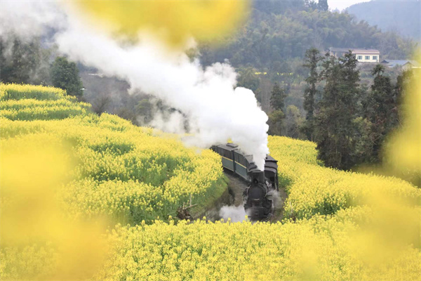 而在乐山市犍为县嘉阳·桫椤湖旅游景区,金灿灿的油菜花正开得热烈。一列“开往春天的小火车”穿梭在成片油菜花海中,成为当地有名的网红打卡地,已吸引游客近4万人次。