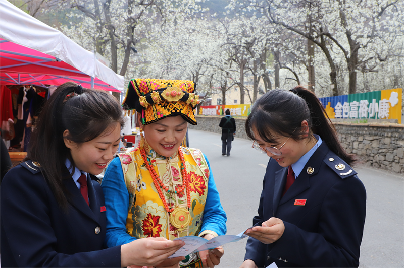 在梨花节农特产展销现场,人声鼎沸,热闹非凡,金川县相关部门、各乡镇及各大专业合作社设立的展位前人头攒动,一抹“税务蓝”格外耀眼。