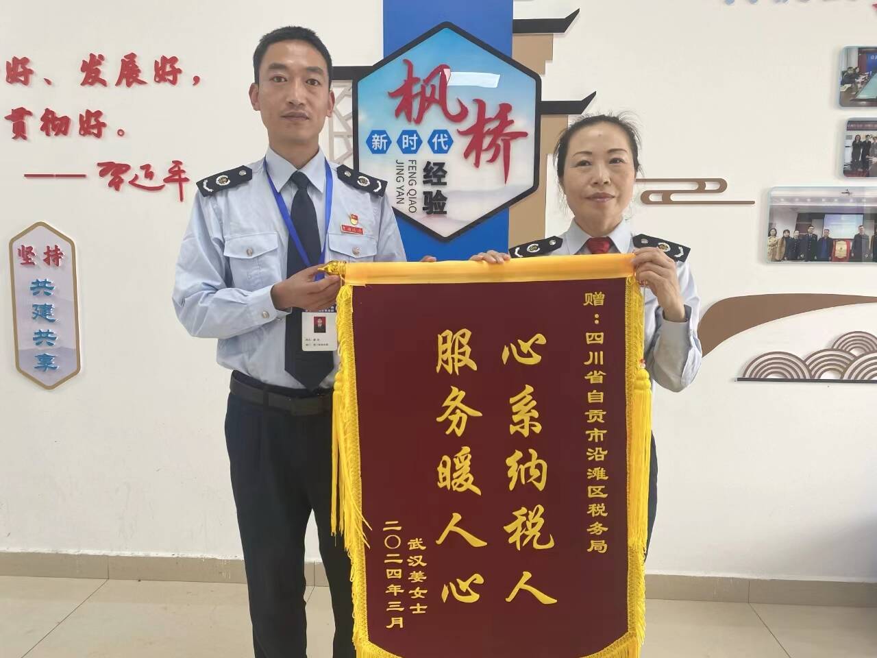 “手上这面沉甸甸的锦旗,是群众对我们工作的认可,让我切身感受到了群众的质朴情怀,它将激励我们更好地履行为民服务的职责使命。”在收到姜女士邮寄来的锦旗后,自贡市沿滩区税务局第一税务分局局长虞波郑重地说。