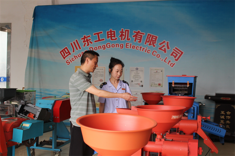 税务干部到四川东工电机有限公司了解农机设备生产情况。(摄影:冯莉)