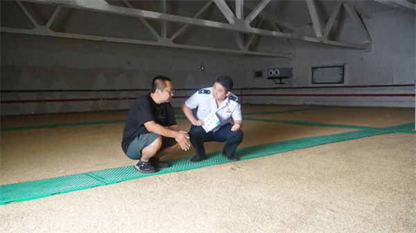 税务干部到四川省犍为县五里坪粮油购销有限责任公司仓库了解粮食储备情况(王莹珺 摄)