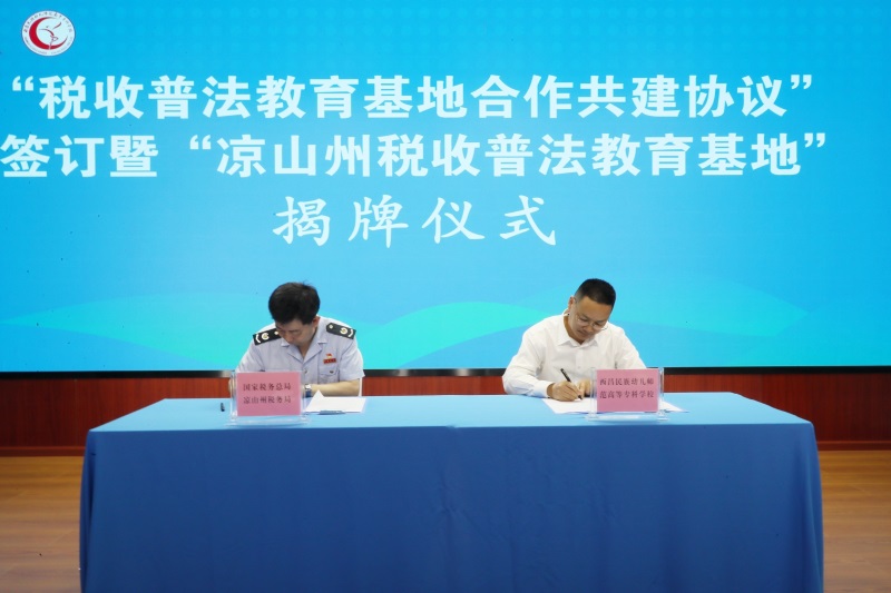 为深入推进“税务+高校”合作,州税务局、西昌民族幼专双方共同签署“税收普法教育基地合作共建协议”,并为“凉山州税收普法教育基地”揭牌。