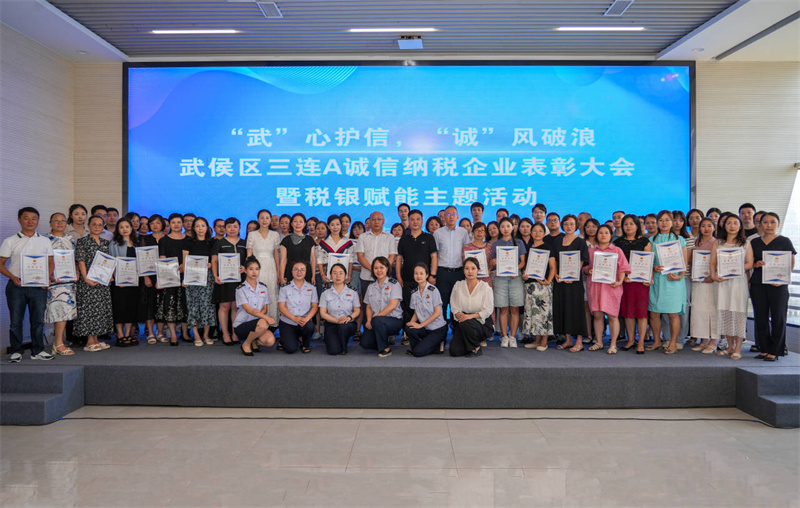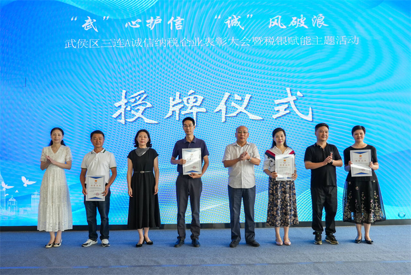 为进一步发挥纳税信用等级“3连A”企业的示范引领作用,弘扬诚信纳税理念,推进营商环境不断优化,9月4日,国家税务总局成都市武侯区税务局联合区发改局、区工商联、中国工商银行滨江支行举行“武”心护信 “诚”风破浪——武侯区“3连A”诚信纳税企业表彰大会暨税银赋能主题活动,由各部门出席领导为守信企业代表现场授牌。