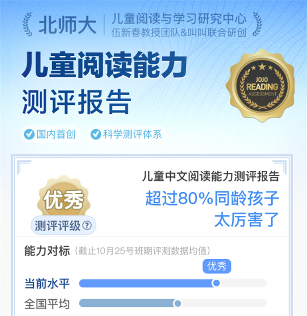 融合了叫叫超千万用户阅读行为习惯数据和北京师范大学伍新春教授团队近三十年的学术研究成果,这款儿童中文阅读能力测评体系成为“撬动”儿童阅读能力提升的“杠杆”。据介绍,该测评体系以国际阅读素养进展研究框架(PIRLS)为基础,紧密结合最新义务教育阶段相关课程标准对孩子审辨性思维能力的培养要求,既具备国际视野,也适应国内实际环境及需求。