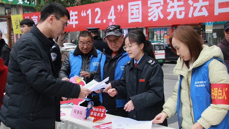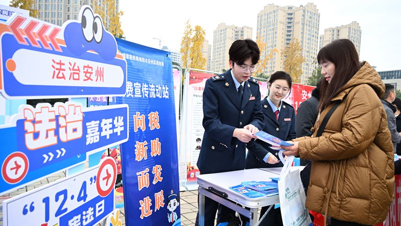 除此之外,在安州区文化广场,税务联合多部门设立“普法加油站”,税务青年普法服务队穿梭其中,用一句句通俗易懂的话语,为参与者普及宪法知识,同时还结合子女教育、房屋赠予等生活热点开展税惠政策宣传,不仅让法治的种子般播撒在居民心间,更让税惠福利落入居民袋中。